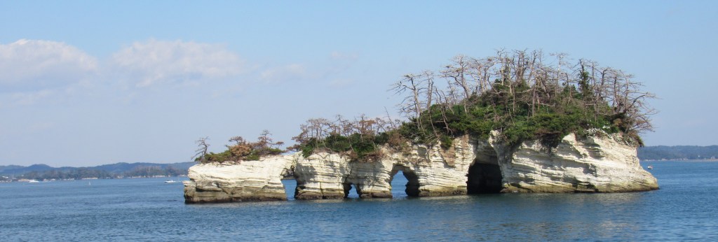 So here I was taking in this stop on Bashō’s route with my ready reference copy of his travelogue. It was a crisp blue day, chilly but not chilling, and no rain threatening on the horizon. He didn’t get to see the lake by boat, but I was not going to miss that opportunity. The lake has more than two hundred tiny islands on it, and I was drawn to Bashō’s description because his islands were alive: unfolding and caressing, animate landscape, stilled in a posture of gentle preening. I was not disappointed. One set of islands rippled across the lake surface, culminating in the outstretched arm of a pine gesturing towards the blue distance. Another loomed, solitary and stoic. A sea-dragon reared above the water’s surface. A shy figure crouched between parted curtains. I posed for a selfie, my scarf rippling into the blue air.